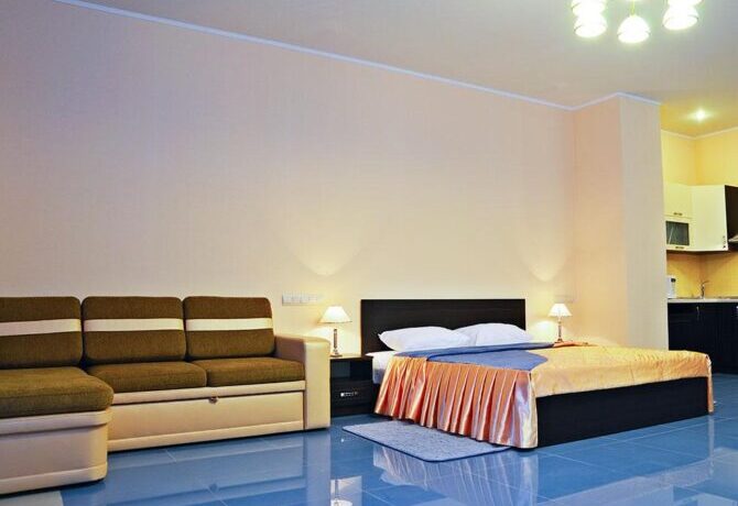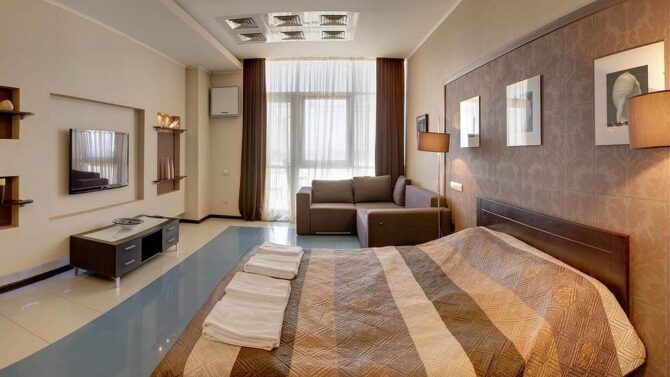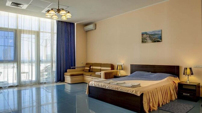 Junior Suite has an area of 50-60 m2 and consists of a combined bathroom, a long balcony and a large room divided into a living and sleeping area. Panoramic windows and a balcony offer impressive sea and mountain views. The standard room is equipped with air conditioning, a corner sofa, a dining area with a kitchenette. Designed for 2 people, but if desired, you can settle 4x. Price from 6700r per day.