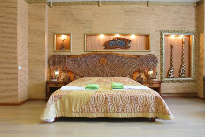 The suite comes in two types: “sea” and “mountains”. With an area of 100 m2, a microwave and outdoor rattan furniture on the terrace are added to the equipment of the “junior suite”. Instead of one room, there are two – a bedroom and a living room. It turns out a huge and half-empty room, where you can play mini-football with children. With a view of the sea will cost from 8400r, with a view of the mountains and an area of 60 m2 from 5600r.