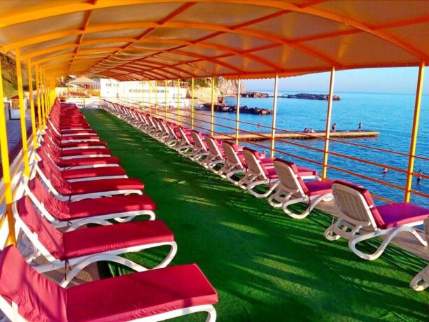 At the same time, more than 500 people can live here in rooms of various categories – for every taste and budget. The most often booked is considered to be an improved and family standard, many guests come with children. All rooms are renovated recently, furnished with comfortable modern furniture, equipped with climatic appliances, refrigerator, TV. Almost all rooms – a view of the sea, pine groves, the territory of the park.