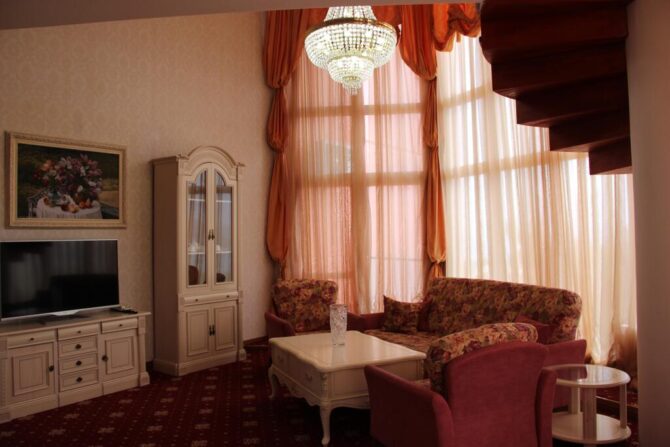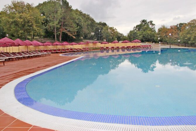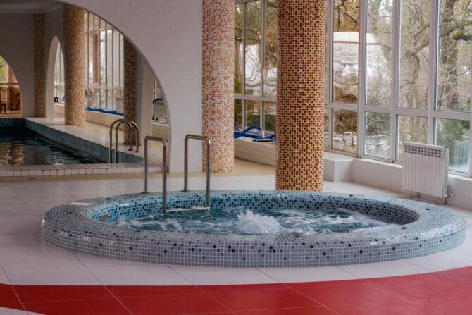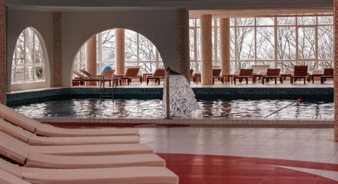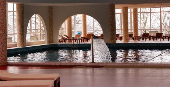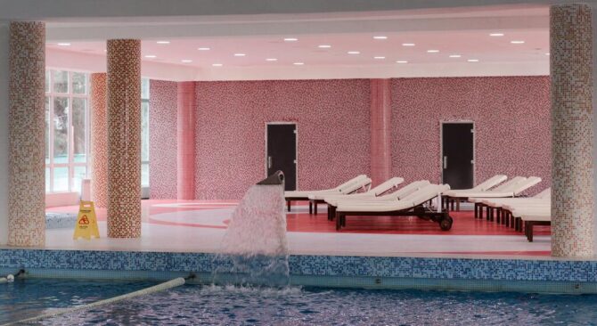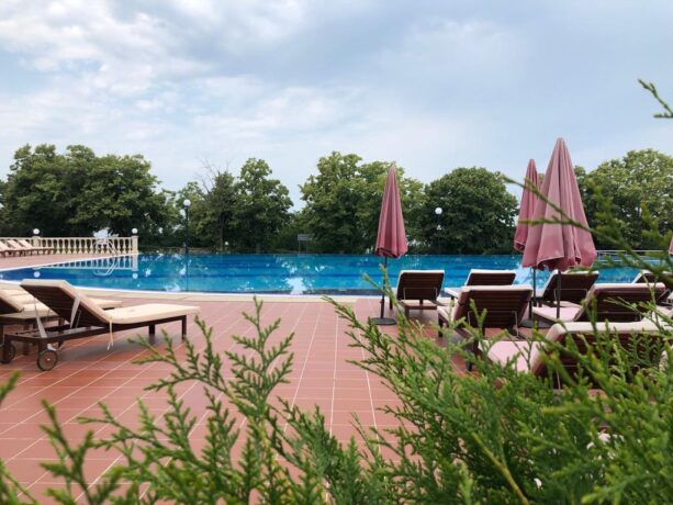 The hotel always has two swimming pools: outdoor and indoor. Many guests note that they try to swim in the open because of its uniqueness – it looks like a lake in shape, and is surrounded by green trees – this is an incomparable pleasure. The water in it is heated to the optimum temperature, so guests can swim at almost any time of the year. It is also convenient that the children’s, shallow, zone is nearby, and you can always monitor the safety of your child.