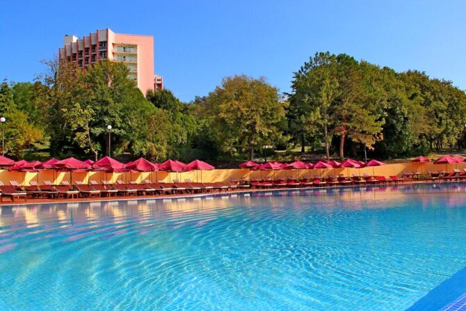 The hotel is located on the territory of 15 hectares and consists of several residential buildings of different number of storeys. Despite the fact that it was built more than 50 years ago, it looks very well-groomed and modern – the administration regularly conducts renovations.