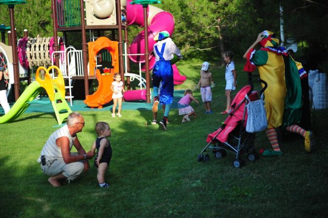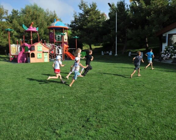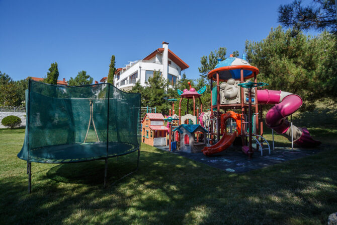 A playground for children is located in a clearing with a green lawn. There are slides, trampolines, swings, houses and various toys. Kids love to play with each other here under the supervision of adults.