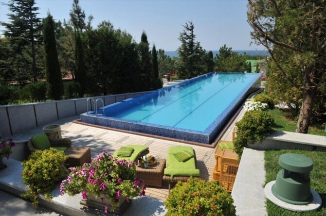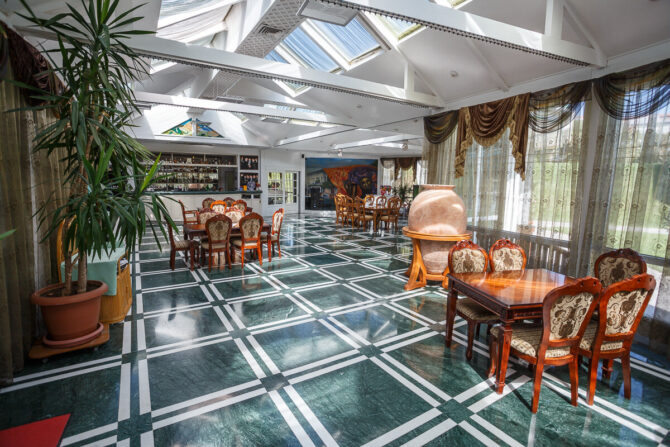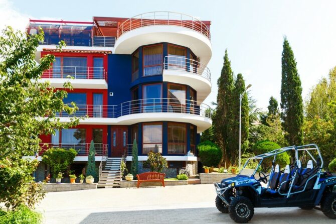 Such famous people as Lev Leshchenko, Alexander Rosenbaum, Alsou and others rested here. Gorgeous sandy beach, beautiful territory, spa, delicious breakfast, privacy – so briefly you can describe the advantages of this residence. A good option for those who are looking for a relaxing holiday in an atmosphere of luxury and hot climate of the Crimea. Separately, it is necessary to mention the local park – this is an example of garden art. Trees, flower arrangements, bushes, decorative decorations – everything looks beautiful and organic.