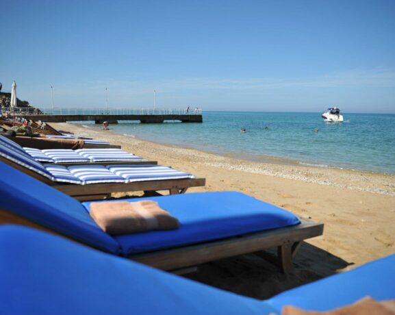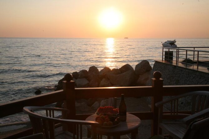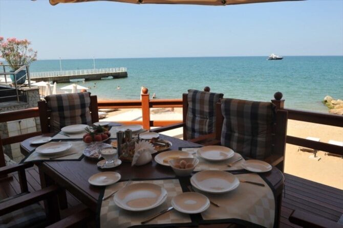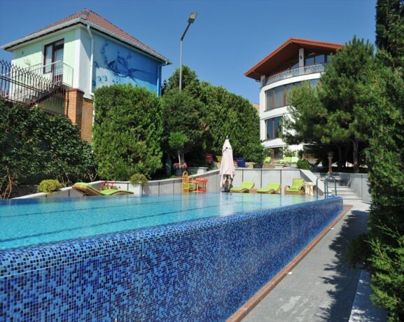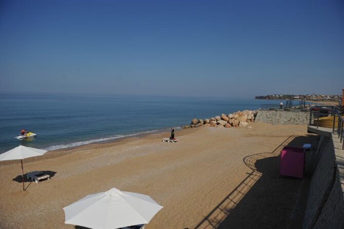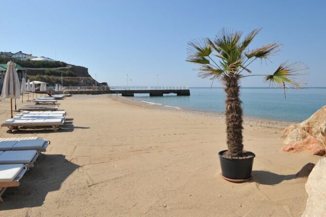 The closed sandy beach of the hotel has practically no drawbacks. For vacationers there are sun loungers and umbrellas, the beach area is cleared of stones. There is a pier from which you can dive into the water. Summer bar sells refreshing drinks, cocktails, ice cream. The territory is fenced – only hotel guests rest. You can rent jet skis, jet skis and even a real yacht.