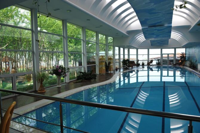 The hotel has two large swimming pools – outdoor and indoor in the spa. Guests are allowed only in the indoor pool, which, however, is enough to swim (25 meters in length). Outdoor swimming pool only for VIPs or host guests. There are several types of steam room: sauna, hammam and Russian bath. You can also order body care, thalassotherapy, massage and buy products in the phyto-bar. The menu includes healthy drinks and snacks. Prices for services must be specified when booking.