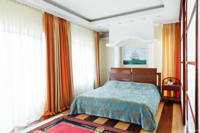 - Exclusive are luxury rooms with an area of 65-80 m2 with individual interior and furnishings. They are located on the 3rd floor, from where the windows offer a beautiful view of the sea. The design of the rooms is dominated by bright colors: stained glass windows, multi-level ceilings, elite furniture, carpets, panoramic glazing. There are options with a shower or hot tub.