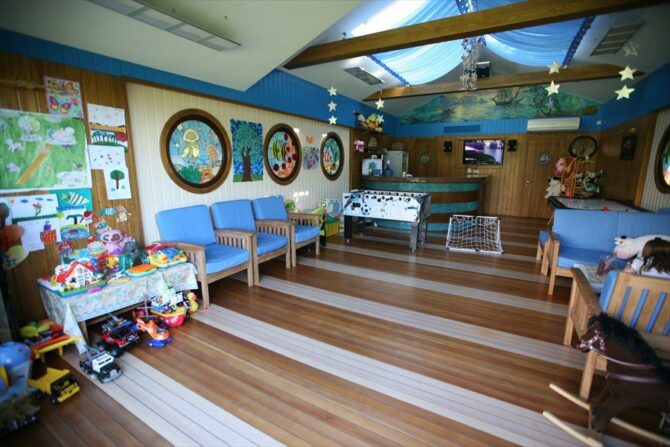 The Kids Club is a small room in which there are two air hockey machines and several tables with soft chairs. For children there are soft toys, cars, board and educational games. There are books for different ages. Animators play different games with children and look after them while parents can relax a little.