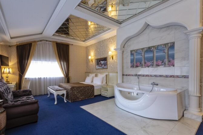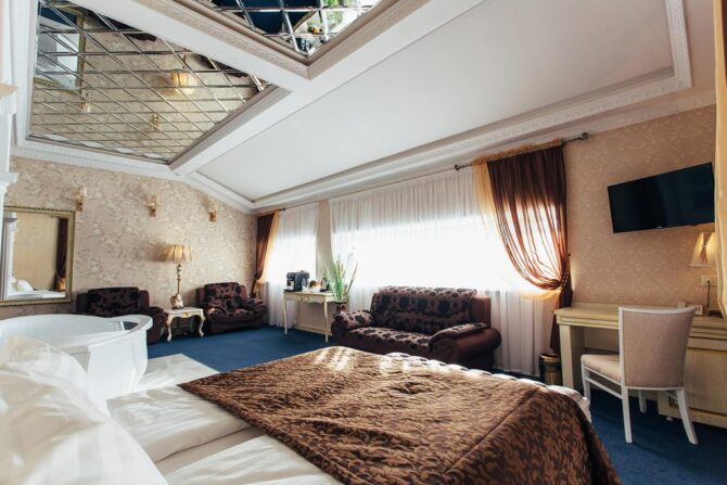 - Exclusive Suite – usually this room is offered to the newlyweds for the wedding night or rented for romantic dates. It is located on the top floor. The atmosphere of relaxation and comfort is complemented by the Jacuzzi installed in the room.