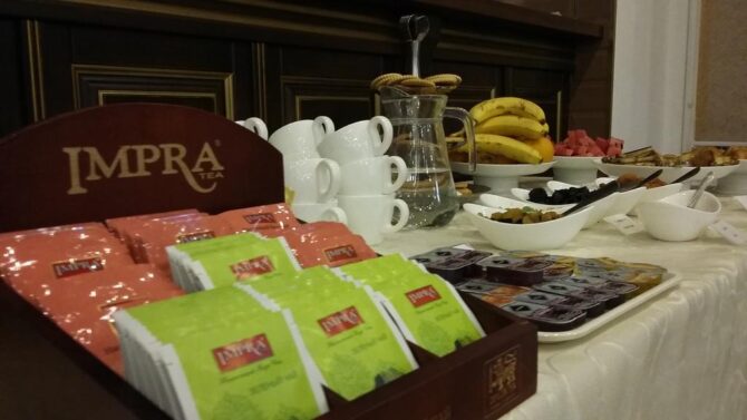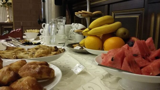 Breakfast is included in the price. It is prepared and served in the on-site restaurant “Viale”. The format of the breakfast is “buffet”. In addition to the dining room, the restaurant has an outdoor terrace. Everything is decorated in European style, grilled dishes are served, the bar offers a good wine list. The service is brought to European standards. Recently, the kitchen specializes in cooking with delivery, so you can order food without leaving the room.