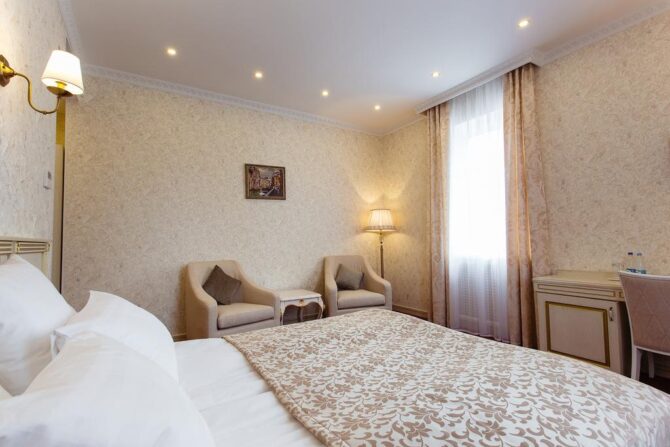The hotel has 21 rooms. The rooms are decorated in a modern European style. There is a standard bathroom with a shower or bath, a set of bath accessories, a bathrobe, slippers, a hairdryer. The rooms have a digital safe, mini-bar, dishes for tea and evening gatherings.