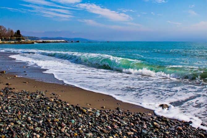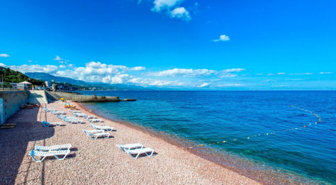- the beach of the sanatorium “Utes” with a pebble coating and excellent infrastructure, lifeguards, medical service work here, water attractions and a children’s playground are installed. Entrance by passes;
