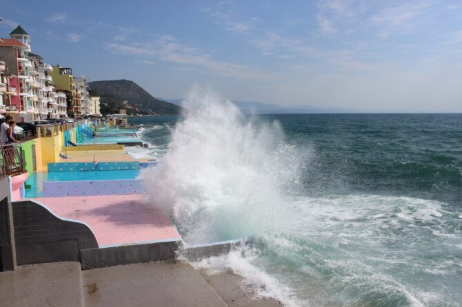 - the beach of the hotel “Arcadia” with a concreted platform of the original design, it is difficult to swim here, people come here to sunbathe.