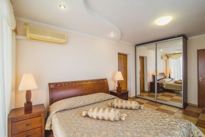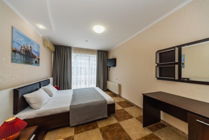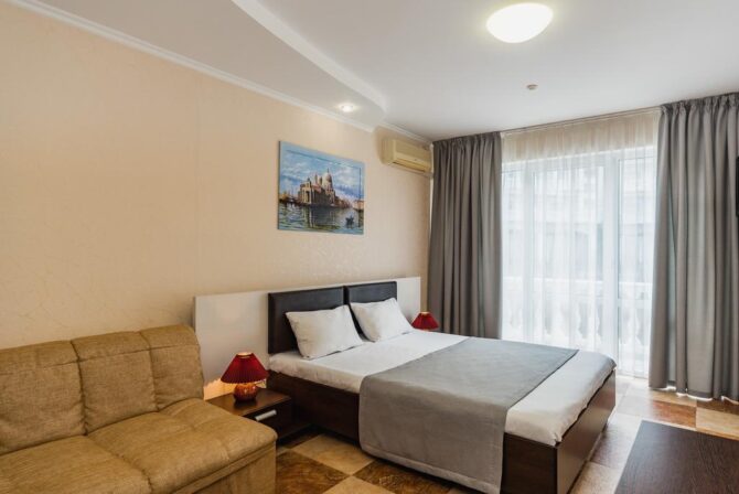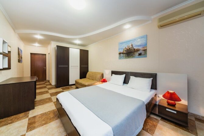 - Comfort (24 sq. m) – a cozy one-room suite with a double bed. The interior is designed in a classic style, which is optimal for people who prefer functionality. The bathroom is combined with a shower. The room has a clothes dryer, kettle, refrigerator. Separately allocated seating area with a comfortable sofa.