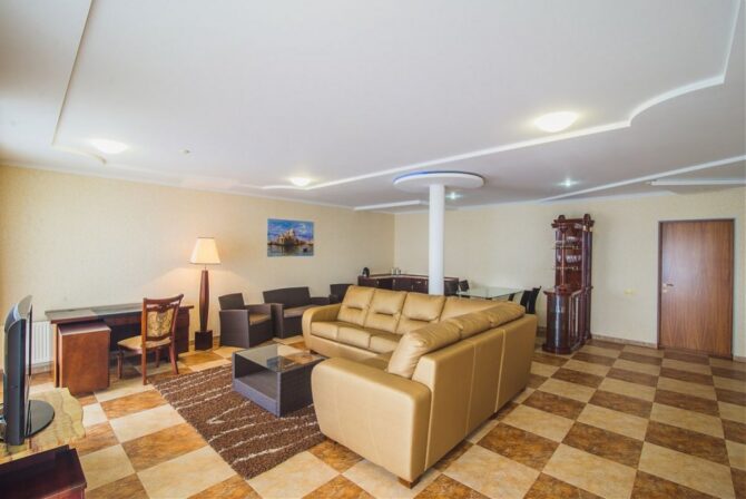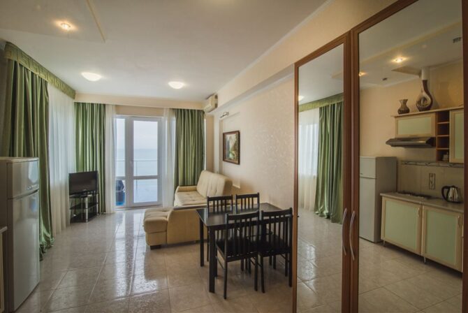 - Suite (60 sq. m)- a comfortable two-room suite with its own terrace. In the spacious living room there is a sofa, a dining table, a large TV, a kitchenette. There is a large bed in the bedroom. On the terrace, in addition to summer furniture, there are soft sun loungers for sunbathing.