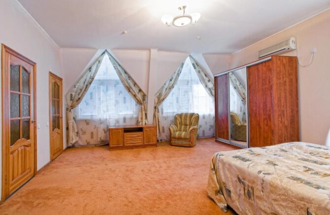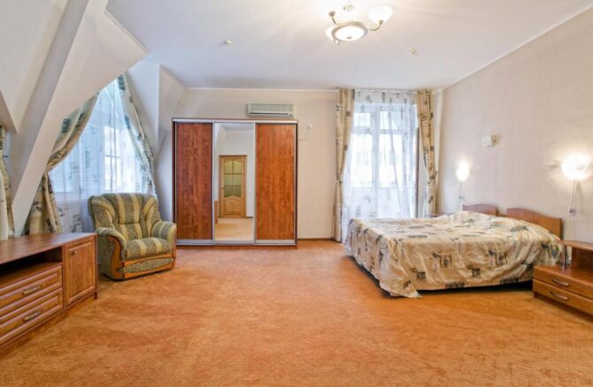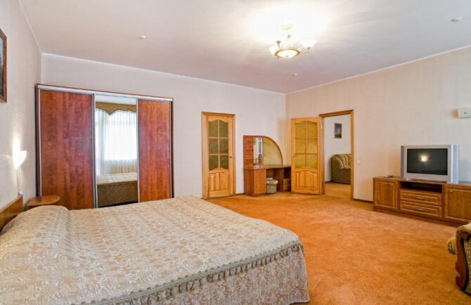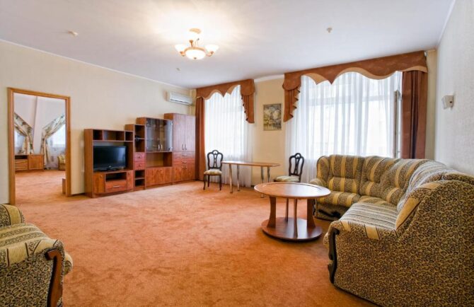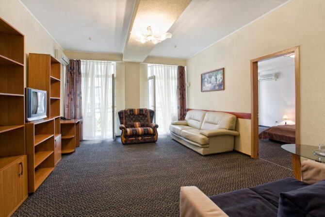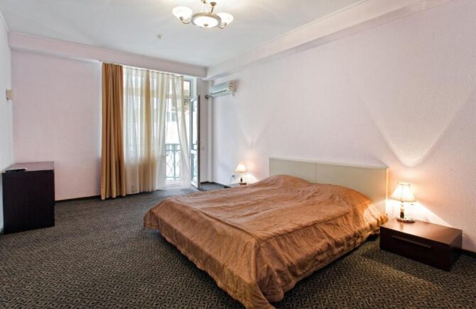 - Domestic. Such a room, in demand among couples with children. In terms of content, it is better than others. It has everything you need to stay for 7 people. The room has a kettle, refrigerator, set of dishes, TV, air conditioning, two double beds, an armchair bed and a sofa that unfolds for an extra bed.