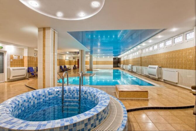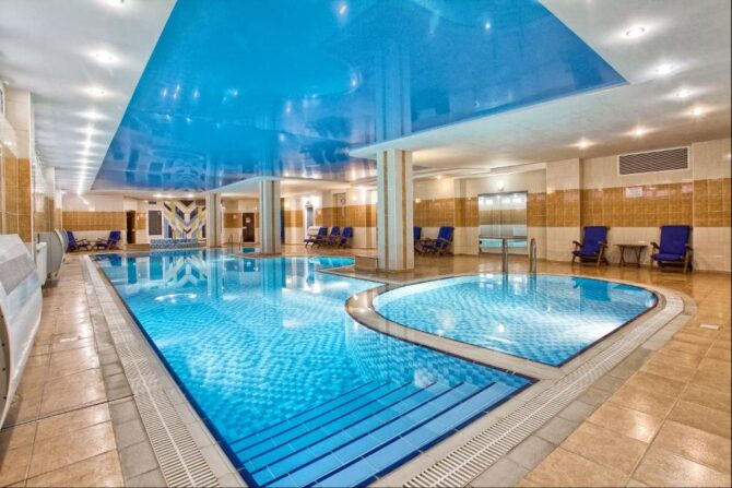 This spa area includes a sauna, massage rooms and beauty treatments. There is also an indoor pool with heated water.