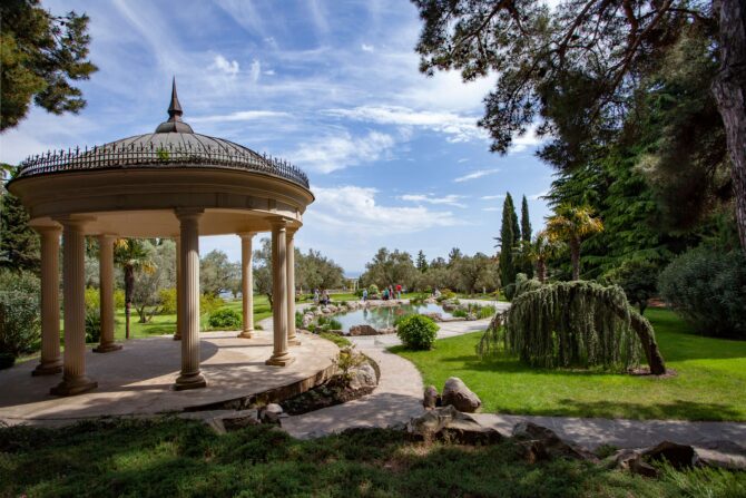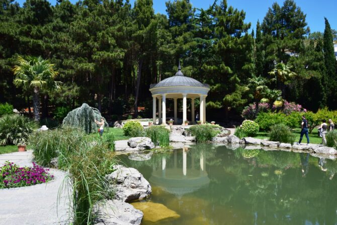 - Park of landscape art Aivazovskoe. Aivazovsky Park is one of the most popular parks in Crimea, located on the Black Sea coast at the foot of Mount Klimentyev, 13 km from Yalta. Founded in 1912 on the initiative of F. P. Ushkov, one of the largest landowners of the Crimea, philanthropist and collector of works of art In the park there are many interesting things. This is not only the largest landscape park in the Crimea, but also the world’s largest field of tulips. In spring, tulips, irises, hyacinths bloom in it. And in the park grow fruit trees, lilacs, grapes. In summer, you can find lavender and other fragrant herbs, and in winter you can go sleigh rides. Throughout the year, flower exhibitions are held in the park, and from May to October concerts are held here.