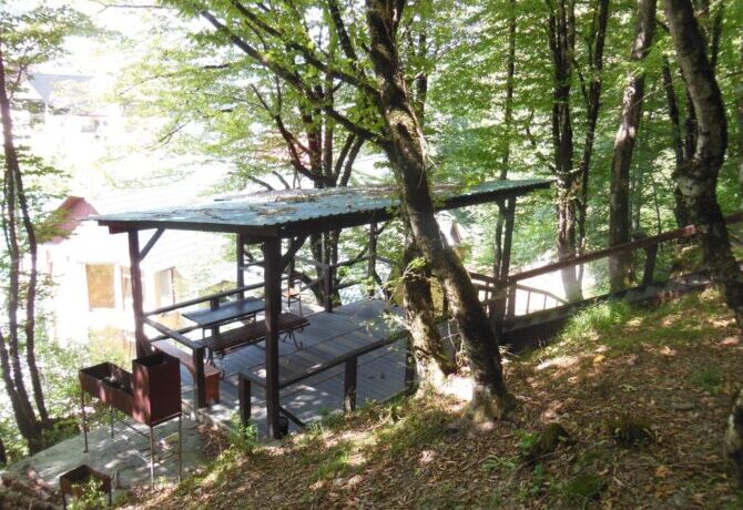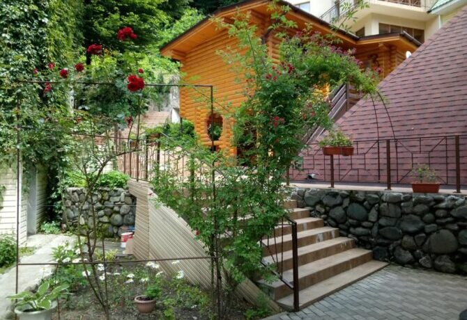 The Mzymta Mountain River is 200 metres away. It divides the village into two halves. On both banks there are embankments. You can walk along them, and at the same time visit the entertainment facilities located nearby. The embankments have pleasant names – Polyanka, Panorama and Lavender. Benches are placed everywhere, trees are planted. The vegetation of the embankment resembles a botanical garden.