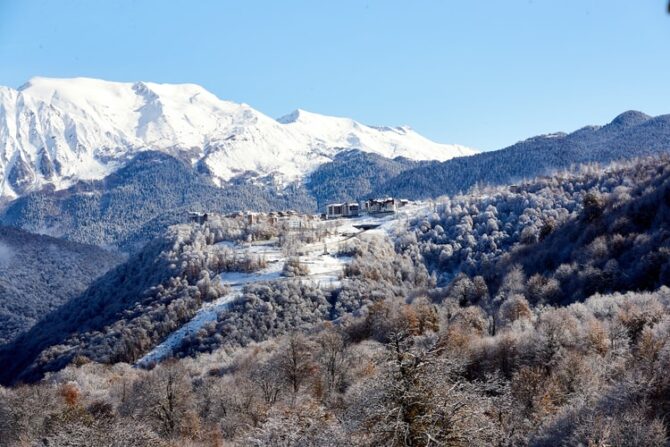 The Alpika Service ski area is located on the slope of Mount Aibga. Alpine territory begins from a height of 2 thousand meters. Here are located alpine meadows, where you can find plants of the pre-glacial period. The terminus of the cable car on the Alpique is called the “Shelter of the Winds”. The peak is located at an altitude of 2256 meters. Here you can visit the highest-altitude bath in the resort. This “Not Easy” with panoramic windows is officially registered in the Russian Guinness Book of Records.