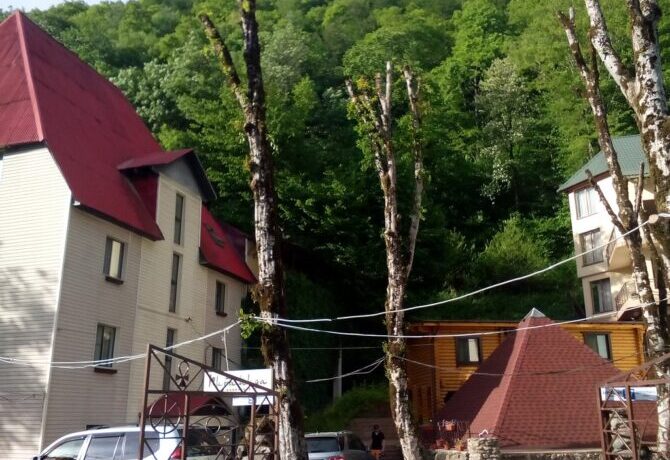 The hotel is located at the foot of the Achishkho Range. Translated from the Adyghe language, it sounds like Horse or Goat Mountain. If you look at the ridge more closely, the outlines of one and the hills really look like the head of one of these animals. Thanks to the gentle slopes, there are many hiking trails that the child can cope with.