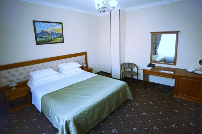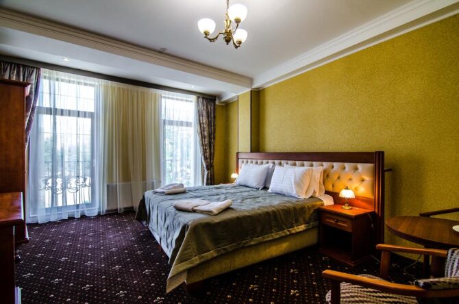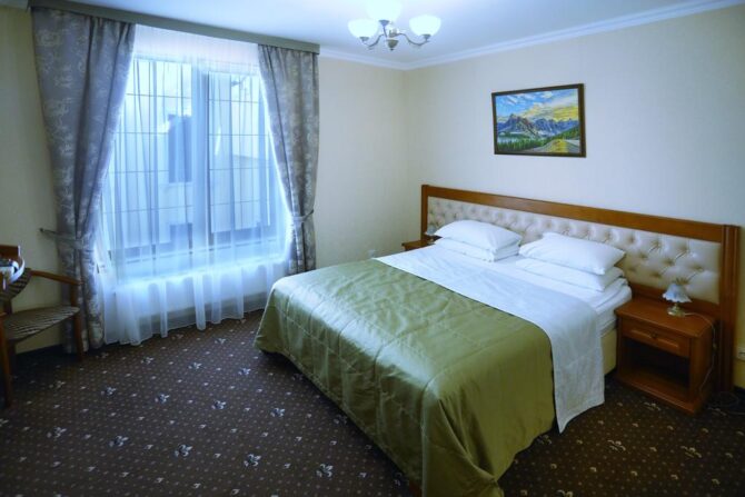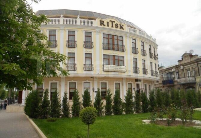 To accommodate guests equipped with 23 comfortable rooms. “Ritsk” after the reconstruction could be called a boutique hotel, but the rooms are not very different from each other in design. After the renovation, the four-story building was transformed for the better, the interiors became lighter and more spacious. They are made in the French style. Each room has a French balcony. Inside – a complete set of furniture, equipped bathroom with shower or bath, safe, air conditioning, refrigerator, Wi-Fi, electronic lock on the door. On the floors there are coolers with hot and cold drinking water. Kettles are not allowed to be used.