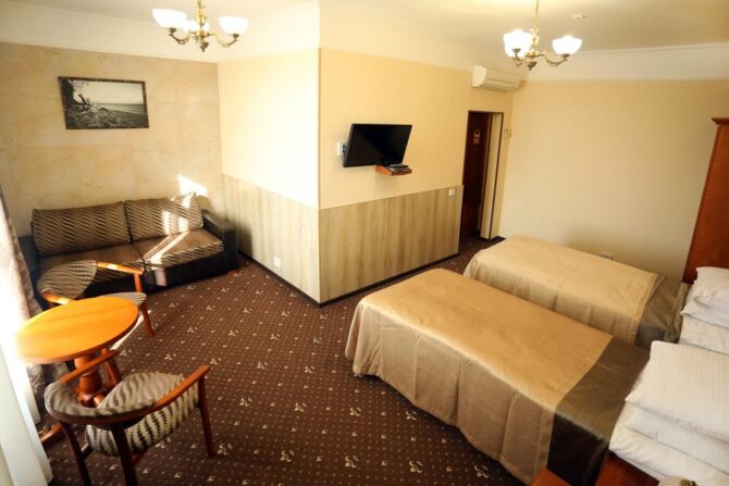 - Standard + (21 sq. m) with a double bed and a non-folding sofa. The room is divided into 2 parts, blocked by a door. One has a bedroom, the other has a living area with a sofa and a TV. The windows overlook the park and the sea.