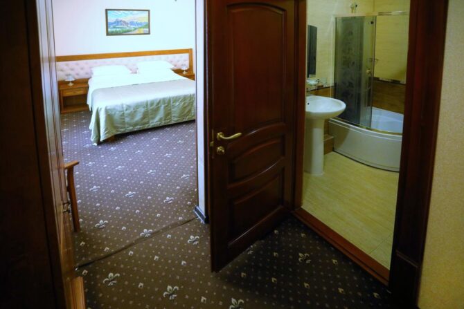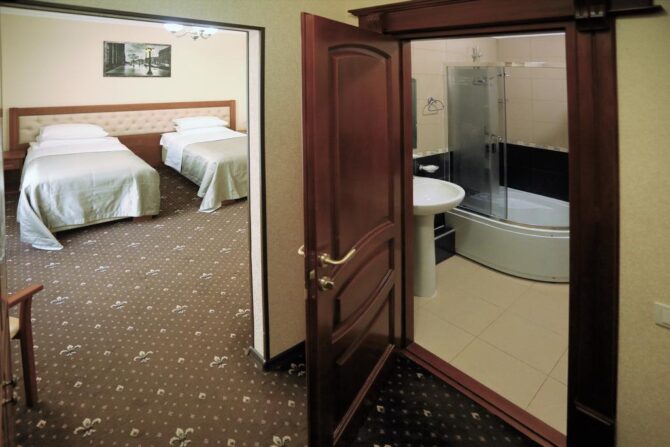 - Junior Suite (23 sq. m) with two single beds or one king-size bed, double sofa bed. This room can accommodate 4 people. The windows overlook the city. Bathrobes are provided in the bathroom in addition to towels. The service includes room service (room service) for food and beverage delivery.