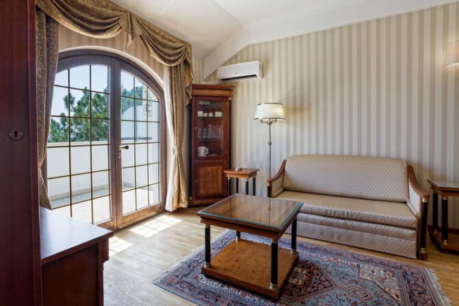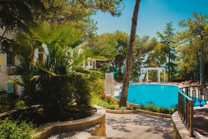 Hotel “Pine Grove” combines a health complex with the convenience of a modern hotel. It is located on the Black Sea coast, 12 kilometers from Yalta. Tropical and subtropical trees have been growing here for more than a century, as well as gardeners plant numerous rose bushes every year. The benefits of natural conditions are complemented by opportunities to improve their health in the hotel “Pine Grove”. Surrounded by hundred-year-old pine trees growing on the seashore, the founder of the park, Prince N. N. Yusupov, built his hunting lodge in the late XIX century and the beginning of the last century. And now it is one of the most comfortable buildings of the sanatorium “Pine Grove”. After a thorough reconstruction in the historic 4-storey building 300 meters from the sea, apartments and suites appeared.