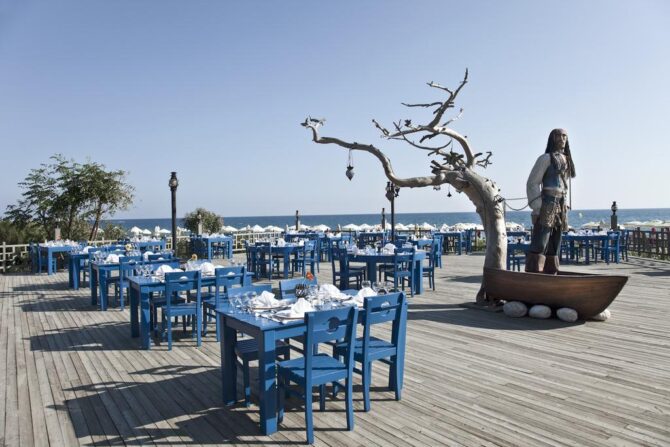 In the evenings, the territory of the hotel becomes an extremely lively place: live music plays and various artists perform, animators are engaged with children, and after dinner a disco with a DJ begins. Get bored at the resort just will not work – for very young children, the hotel provides babysitting services, and also has playgrounds in the open air and inside the building.