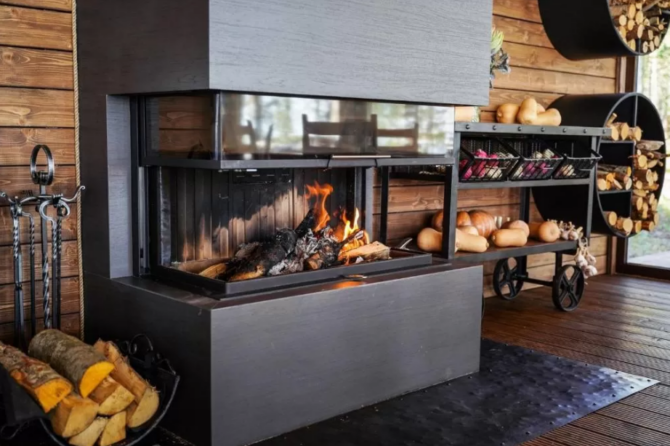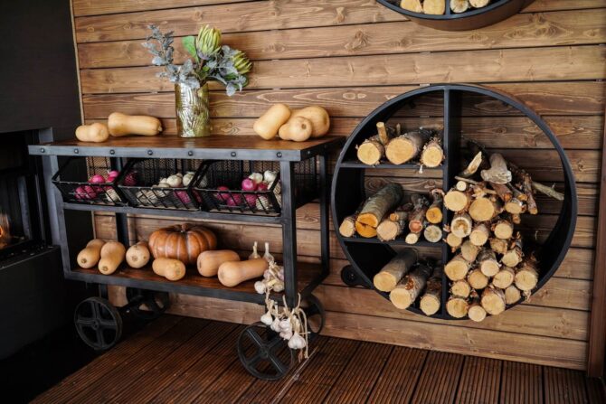 At one of the walls, trimmed with wood, a real fireplace rises, next to which a bundle of logs is stacked. Nearby is a cart filled to the brim with pear-shaped zucchini, pumpkin, onions and garlic. All this creates an atmosphere of a cozy café, reminiscent of those gastronomic establishments for which Austrian and Swiss chalets are famous.