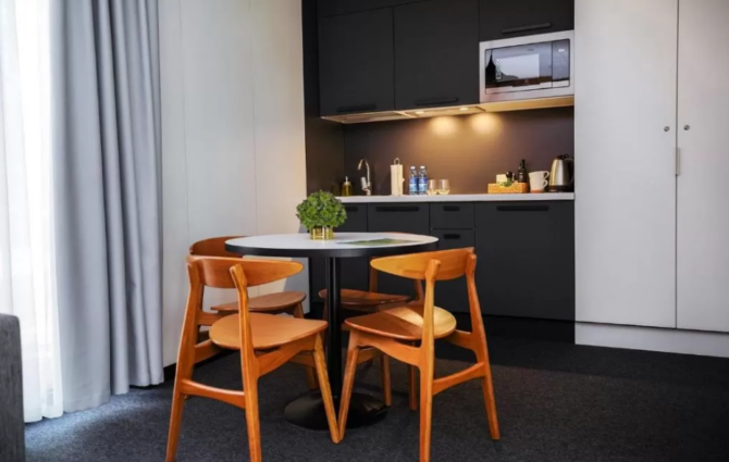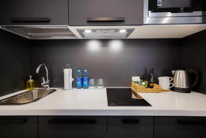 In the living room you can relax on a comfortable sofa. The kitchen area for guests has a table with four chairs, wall cabinets for dishes, a microwave, a sink and a large wardrobe for clothes and linen.