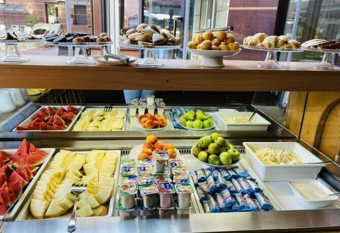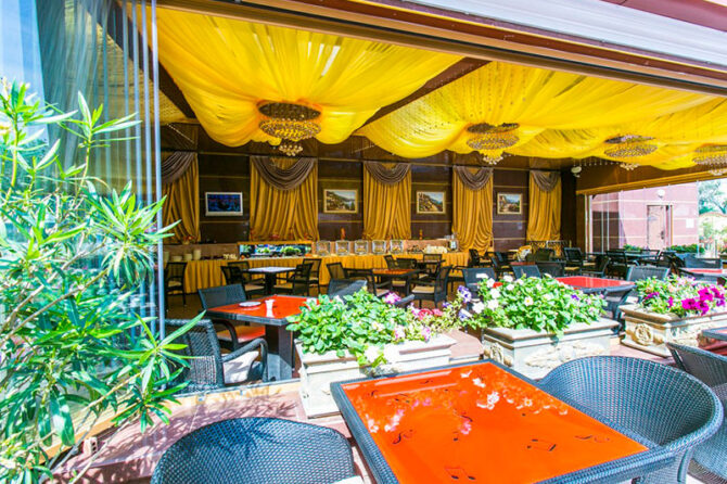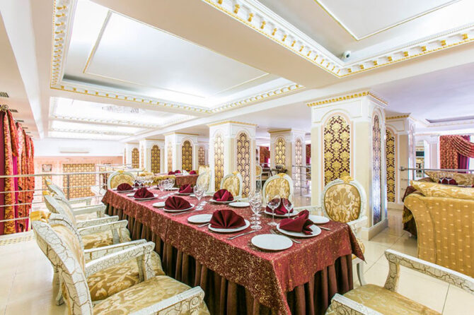 The main restaurant “Ukraine” is engaged in the organization of catering. A breakfast package is available. Depending on the hotel’s occupancy, breakfast is served according to the Swedish system or served in a continental format. The dining room of the restaurant is located on two levels. It is designed for a one-time visit to 100 people. It is decorated in the style of palace refectories. The kitchen specialises in European dishes. There is a separate confectionery shop where you can order cakes for the celebration. For an additional fee, the caring staff will deliver food and drinks to the room (the “room service” service is available only during the kitchen). A summer playground overlooking the pool is located in the courtyard of the hotel complex.