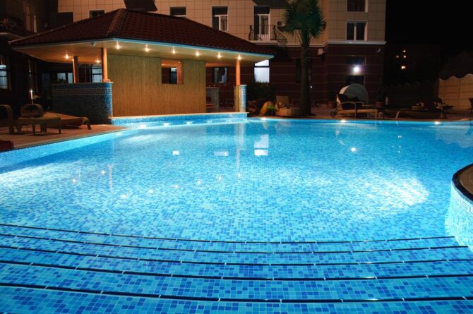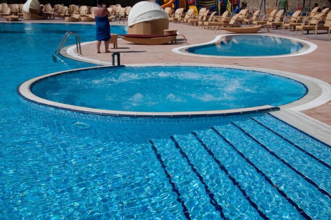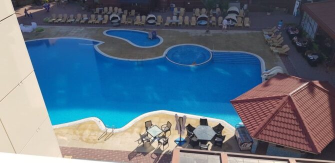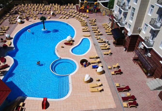 The hotel offers to spend free time on its territory. In the courtyard there is a complex of swimming pools. Around a large pond for adults (depth up to 2 meters) there is a sun terrace with sun loungers and umbrellas. Nearby there is a swimming pool with hydromassage. It is suitable for romantic couples and lovers of relaxation. The shallow pool is designed for younger guests of the hotel. It has slides and a playground built nearby. Access to all swimming pools is included in the price.