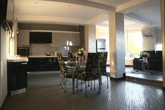 - Apartment No. 102 (60 sq. m.) is a two-room suite with a separate entrance from the street. The bedroom has a double bed. The living room is connected to the kitchen and dining area. There is no balcony, but a barbecue area is available. Therefore, in addition to kitchen utensils, there is a barbecue and grill accessories. The mangal area is located indoors and is available to everyone for a fee.