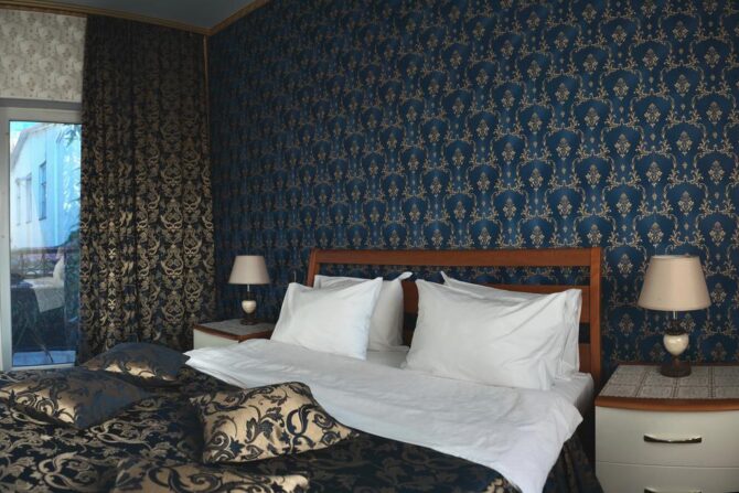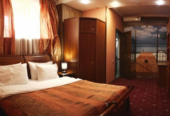 - Standard (30 sq. m) – there is one room of this category (No 107). It can accommodate 1-2 people. There is a double bed. The bathroom has a bidet and a shower. There is a safe for valuables. From household appliances – TV, air conditioning, refrigerator, kettle. A minibar is available for a fee.