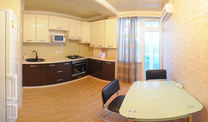 - Apartment “Nikita” on Pozharov 20/3 (56 sq. m) – two-room apartments are located in apartments No. 38, 47, 56, 65. Rooms with renovation, stylish interior, modern plumbing and appliances, underfloor heating. The bathroom has a jacuzzi and a washing machine. Parking near the entrance. A grocery shop and a café can be found 20-30 metres away. Unlike the main building, from here to the sea only 300 meters.