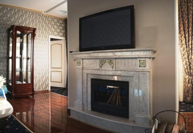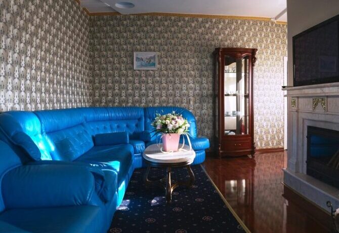 - Two-room suite (60 – 75 sq. m) is designed for a family or a company of 2 to 4 people. There are 5 such rooms in the hotel. Each is decorated in an individual style, with a characteristic design selection of colors. The living room has a fireplace, dining table, seating area. Some rooms have a furnished balcony. Bathroom with shower and bidet.