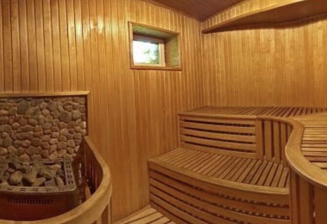 - Duplex No. 103 (80 sq. m.) is a two-storey room with a sauna, a swimming pool and three rooms. It has a separate entrance from the street, so it is usually rented out at an hourly rate, like a regular sauna. It is ordered by both hotel guests and others who want to take a steam break in a cozy intimate atmosphere. A microwave oven is additionally installed from household appliances. On the ground floor there is a sauna, a swimming pool without heating, a bathroom with a shower. On the second floor there is a bedroom with a bed and a half and a living room with a sofa bed, a kitchenette.