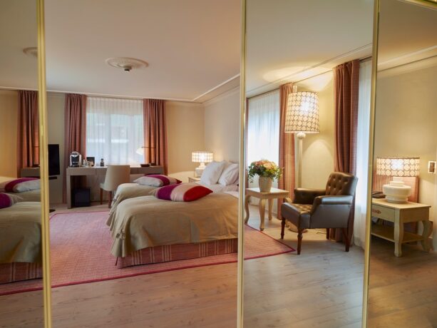 The 5-star Alpina Gstaad features 3 restaurants and a private cinema. Located in a green area of Gstaad, the complex is designed in a traditional Swiss style. Like the hotels next door, the Alpina stands close to ski resorts and ski lifts.