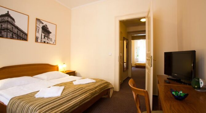 The large hotel consisting of 74 elegantly furnished rooms is pleased to welcome you to the centre of Prague. Each room is equipped with such an important in the modern world free access to the world wide web, air conditioning, safe, comfortable bed, bathroom. In addition, each guest is provided with free beer and water. There is also a lobby bar, laundry facilities and parking for those who like to travel by private vehicle. A delicious and hearty breakfast is also available.