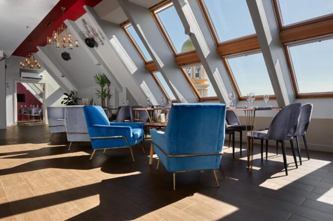 The hotel’s restaurants and bars, offering a wide range of food and drinks, can satisfy every need. Restaurant “Dostoevsky” is located on the fifth floor of the hotel and accommodates 150 people. The menu presents dishes of Russian and European cuisine, as well as elite drinks and wines for every taste. It serves a buffet breakfast from 7:00 to 10:30 and brunch from 13:00 to 17:00. On the seventh floor of the hotel there is a bar “Raskolnikov”, which offers a panoramic view of the city. Designed for 40 people. Works around the clock.