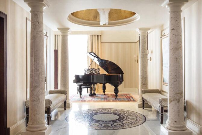The luxurious rooms perfectly combine royal sophistication and elegance of interior decoration and design with all modern technologies.