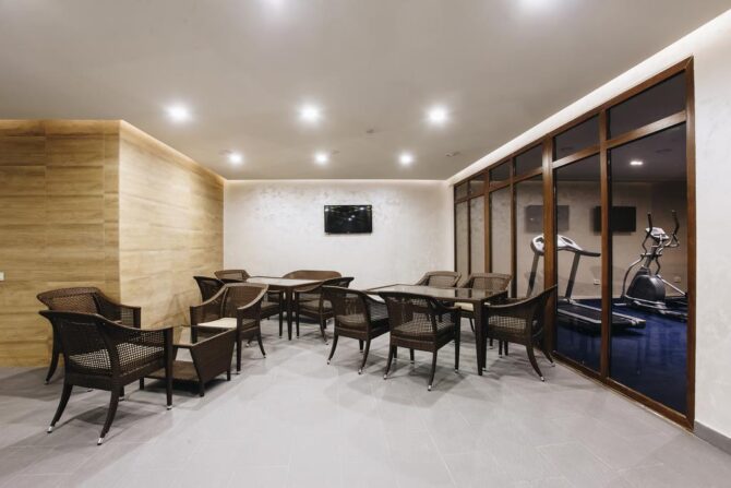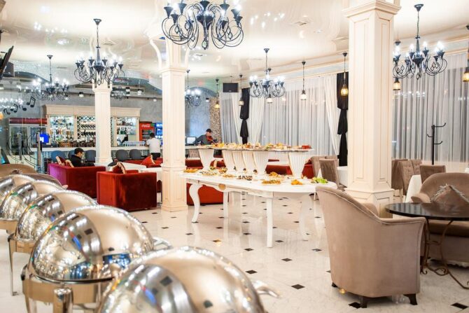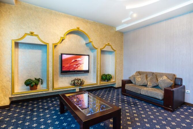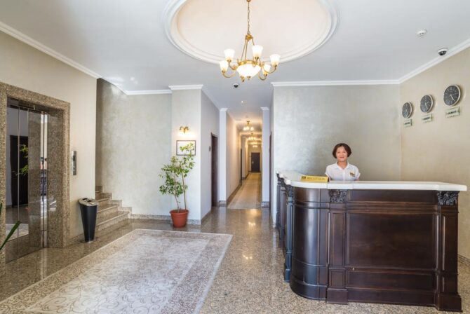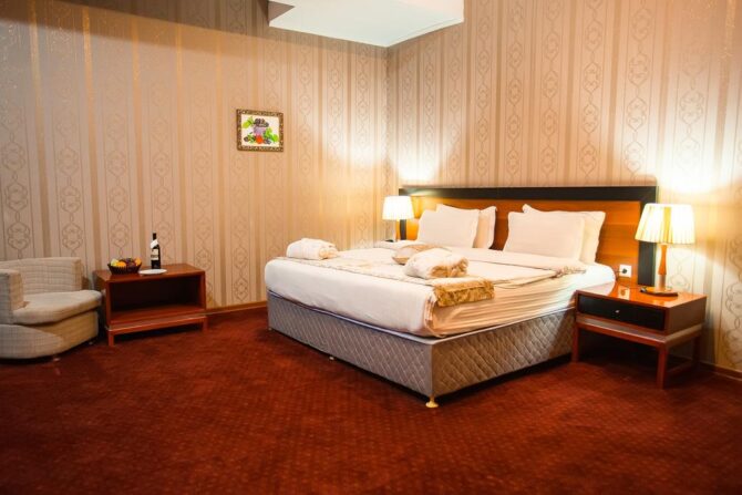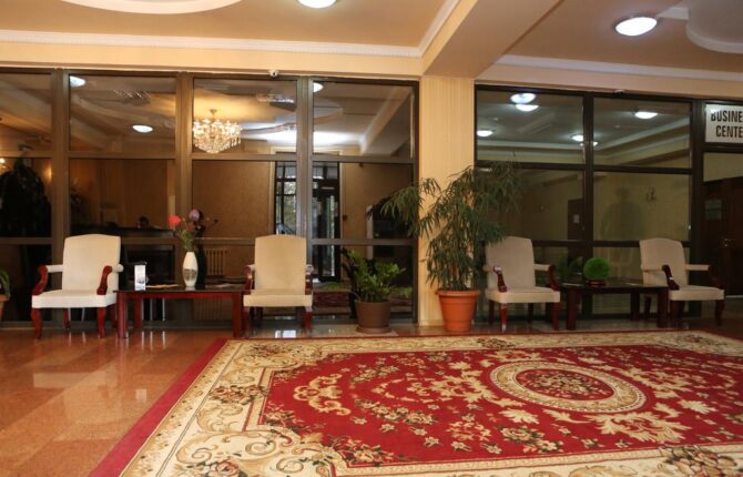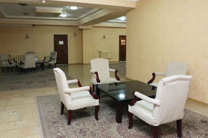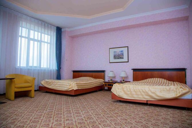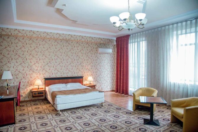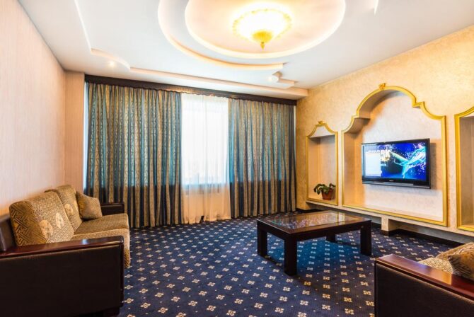 11 km from the airport is the 4-star Renion Park Hotel. There are 90 rooms available for accommodation. They are all soundproof. According to the level of comfort, the number of rooms includes economy, suite, standard, deluxe, family options. To services of guests: a hall for fitness classes, SPA and body care, swimming pool, 24-hour rus-service. Breakfast is served in packed lunch boxes. During the day there is a restaurant serving oriental cuisine and a dining room. Literally across the street there is a park named after 28 Panfilov guardsmen and Kolsai lakes. This is one of the favorite places for walks among citizens and guests of the former Kazakh capital. 400 meters from the hotel stands the Ascension Cathedral – the main local Christian shrine.