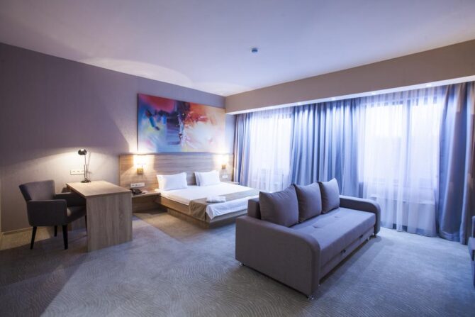 This trendy 3-star hotel is located 7 km from the airport. It offers 47 cosy rooms. In their interiors there are no unnecessary details, only what the traveler needs: a bed, a safe, a coffee/tea maker and a refrigerator. A buffet breakfast is served daily. The Bublik Bar is a 5-minute walk away. It prepares traditional dishes that will appeal to those who do not like American cuisine. It is on it that the hotel restaurant specializes. Spa and jacuzzi treatments are included. Guests have access to a gym and free public parking.