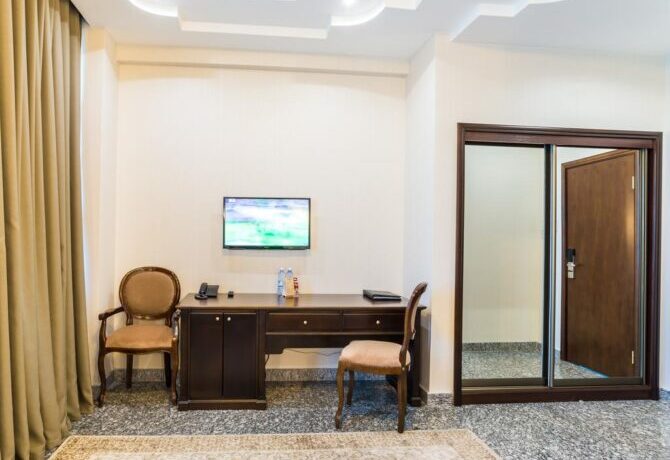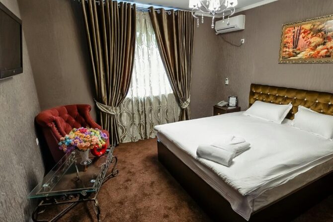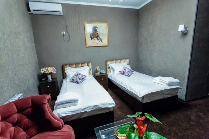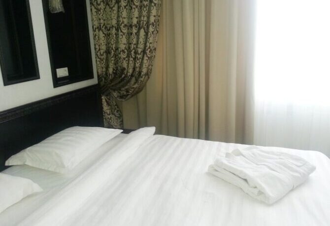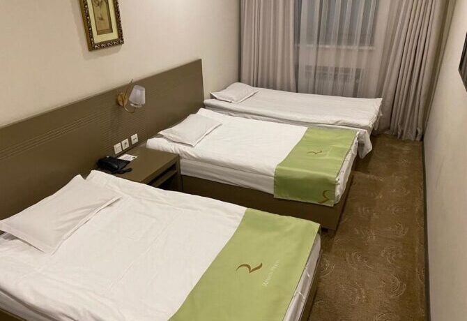 The 4-star hotel is conveniently located to the airport (6 km) and the railway station (1.8 km). The number of rooms includes 20 rooms from economy class to luxury at affordable prices. To services of guests: private parking, restaurant, terrace, gym, car wash 24/7. A halal breakfast is served in the morning. A lounge area is available for relaxation. The hotel has a hairdresser. There is no airport shuttle. Guests are called a taxi. The journey time is 10 minutes.