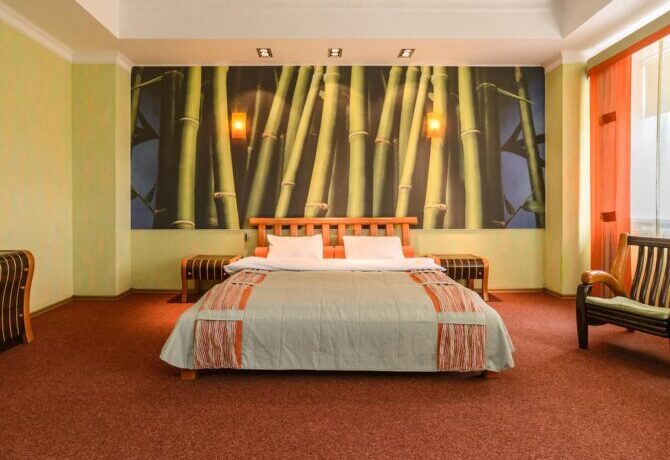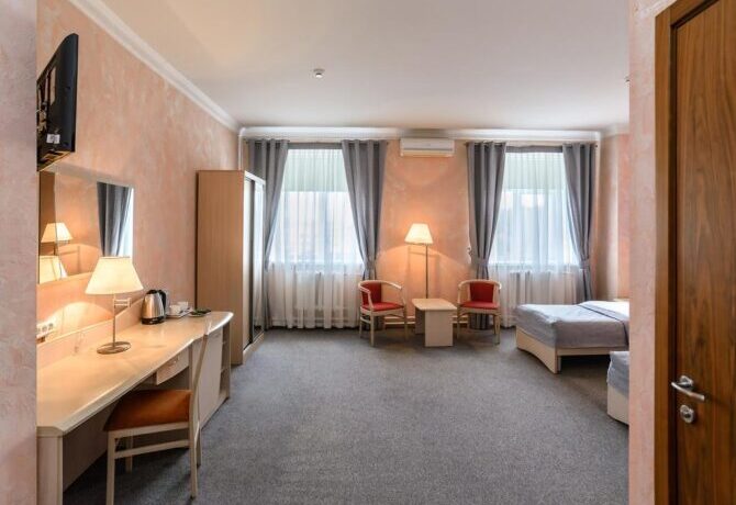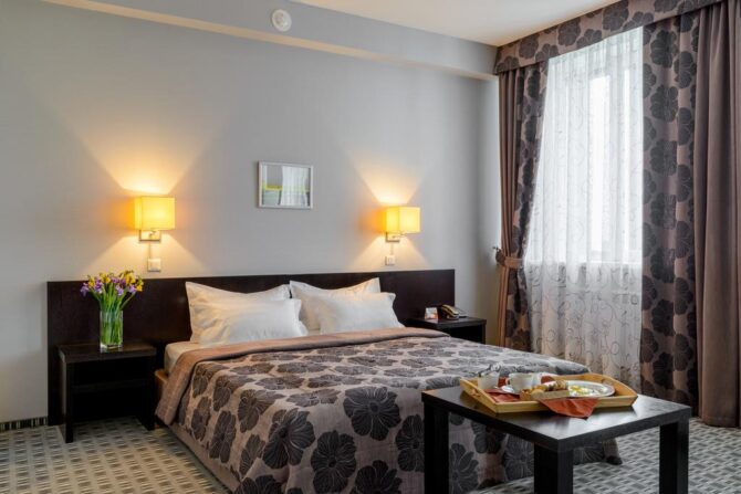 This modern 3-star business hotel is located in the immediate vicinity of the EXPO Center and 6 km from Tolmachevo Airport. The number of rooms includes: standards, apartments, studios,presidential suite. Corporate clients are provided with discounts. Children under 7 years old stay free of charge. To services of guests: Finnish and Turkish baths, billiards, meeting rooms, transfer, lobby bar, bakery. There is an aqua zone with an indoor pool and a gym. The restaurant is open around the clock. Among the special offers is “Tariff without breakfast”. For others, a buffet is served in the morning. The picturesque Bear Lake is 200 metres away. An evening walk or a morning jog along its shore will fill the body with fresh air and give a good mood. A covered heated passage leads to the EXPO-center. By public transport to the center of Novosibirsk will have to get within an hour and a half.