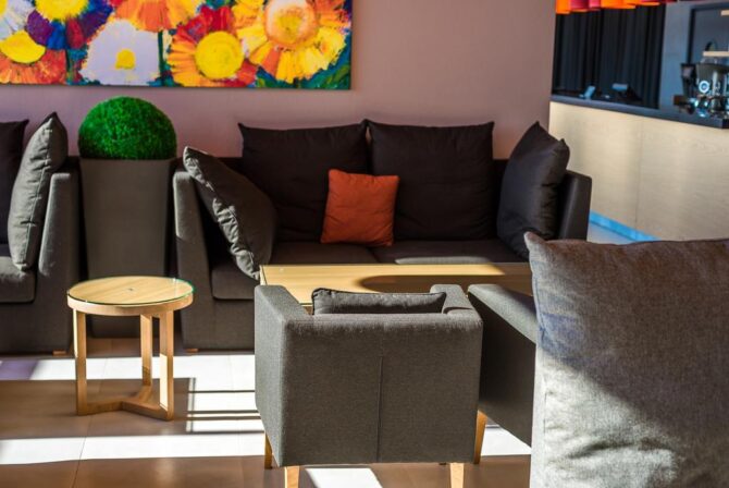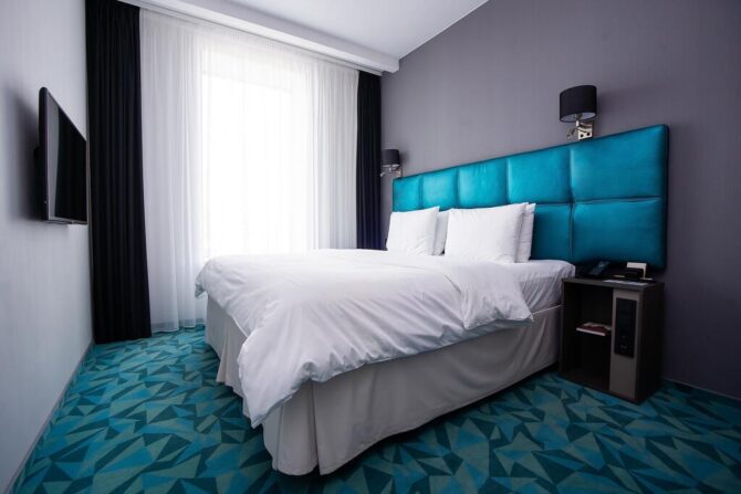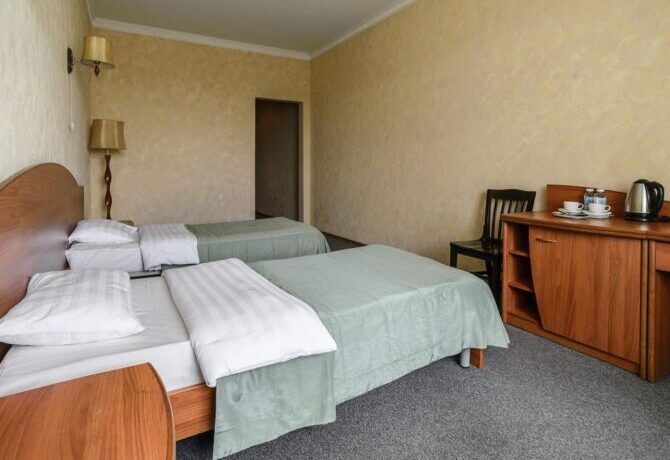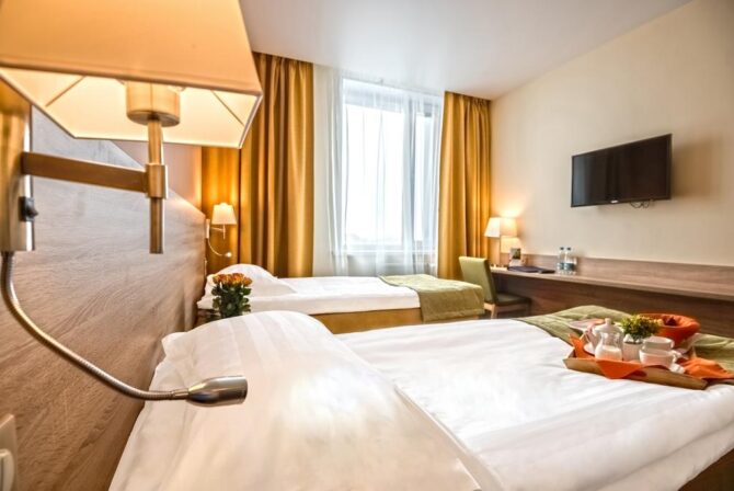 The 4-star hotel is located on the territory of Tolmachevo Airport, 300 meters from the domestic terminal. For accommodation there are three types of rooms: standard, junior suite and apartments. There is a special offer “Early booking” with a 15% discount on accommodation. Meals are organized by a round-the-clock restaurant. Room-service is available. An early breakfast is available until 07.00 upon reservation. Children under 7 years stay free of charge. Corporate clients are provided with discounts. The presence of an aqua zone and a gym, sauna and billiard room make the rest between flights more enjoyable. The bar, like the restaurant, is open around the clock.