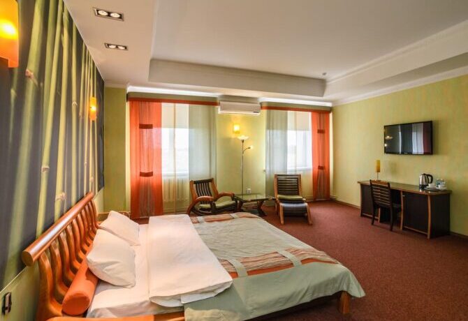 Modern 3-star hotel is located in the heart of Novosibirsk. The main advantages are inexpensive comfortable rooms and the absence of check-out time. The fund has 60 rooms of different price categories. Owners constantly hold promotions and set discounts on accommodation. For example, non-stop weekends are popular, when a suite for two can be rented at an improved standard price. It offers a spa complex with sauna, Turkish bath and hydromassage pool, conference room, café “Kolyada”. An airport shuttle service can be arranged. You can come with animals.