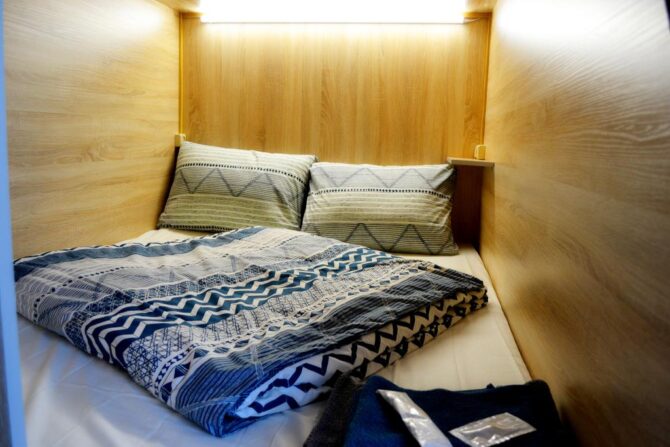 “Spacious capsule, there are sockets, Wi-Fi, light and a small shelf for personal belongings. The hotel has a lobby bar, but you can walk to the nearest cafes or buy food in the supermarket. Pleasant interior, friendly staff» Maya, Russia