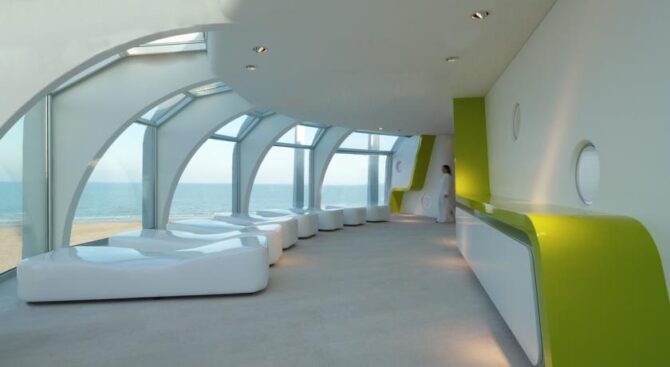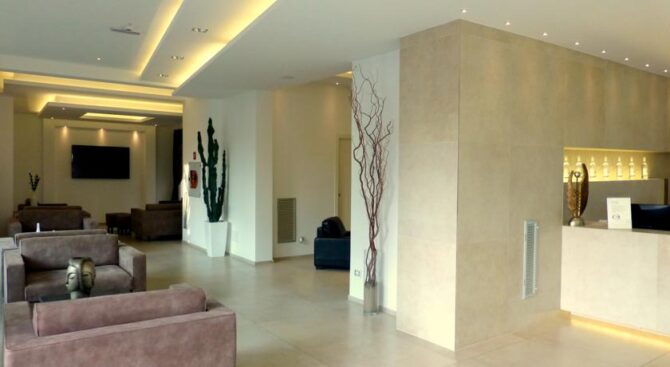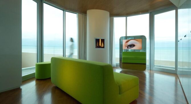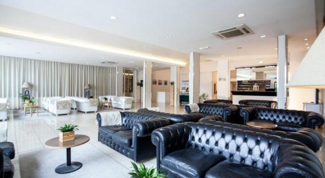 In the lobby of this hotel in Rimini, Italy, guests can spend time in the spacious living room with bar and soft sofas. From here you can also go through a large sliding glass wall to the outdoor terrace, where, sitting at a cozy table, guests of the Hotel Belvedere Spiaggiaprefer to drink coffee or soft drinks. In the restaurant, the chefs surprise guests daily with original snacks and delicious continental cuisine.